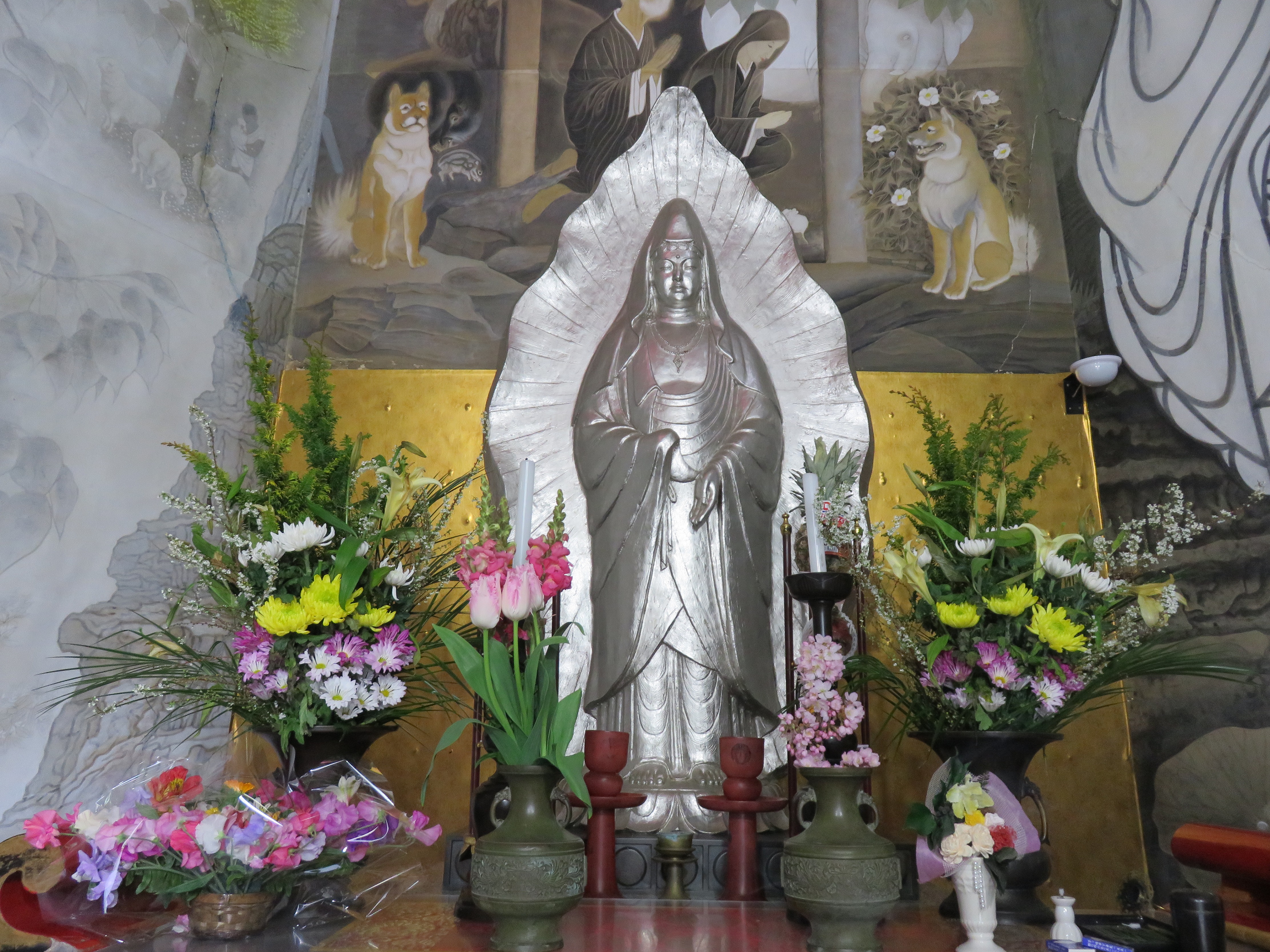 写真は白峰寺観音堂に安置されている白衣観音です。当山の白衣観音への信仰は江戸時代から続き、安産祈願、育児祈願、息災延命や家内安全などを願ってお参りいただいております。お参りの際に献花をいただくことが多く、観音さまの前にはいつも彩りあざやかな花が供えられています。