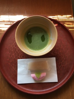 今月の和菓子の銘は新元号になったことに因み、「幕開け」。白い餅が幕をイメージしてます。その奥には、柏餅を模した和菓子。明日(5月5日)が端午の節句なので用意しました。お抹茶と美味しくいただきました。