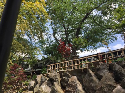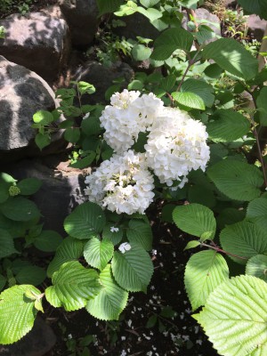 境内をぐるりと囲むようにある桜の花が散り、新緑になりました。その中で、ツツジやオオデマリの花が咲いて、きれいに色づいています。
