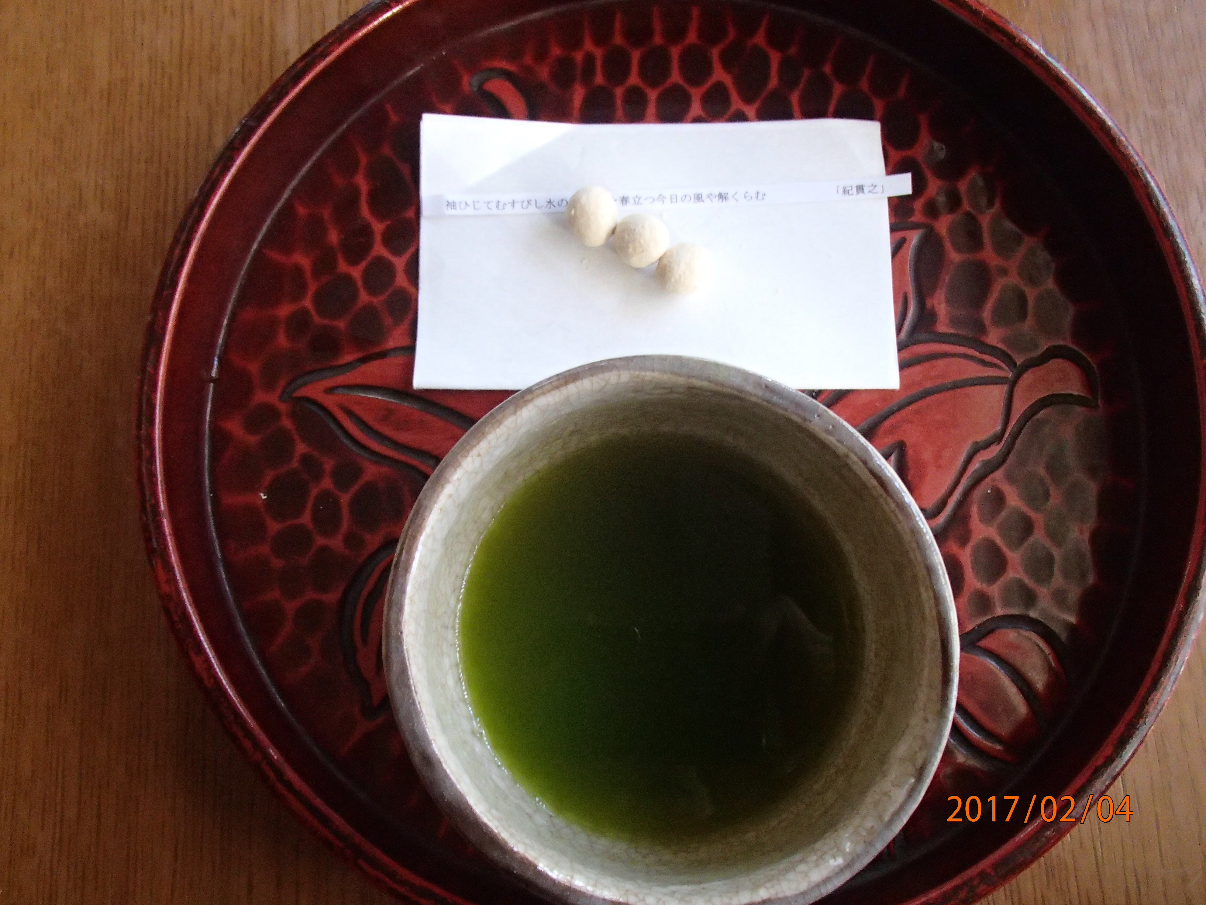 昨日は節分でしたので、それに因み本日の和菓子は「きなこ大豆」でした。美味しくいただきました。そして、本日は立春です。それに因みまして、本日は立春の和歌が詠まれました。