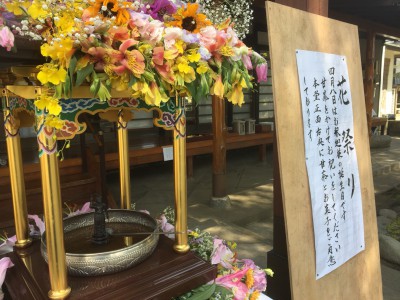 お釈迦さまは、約2500年前の現在のネパール地方のルンビニの花園で釈迦族の王子としてお生まれになりました。その時、仏教の守り神である龍が現れ、お釈迦さまの誕生を祝って甘露(かんろ)の雨を降らせたそうです。花まつりでは、お花で飾られたお堂「花御堂(はなみどう)」に祀られた誕生仏の像に柄杓で甘茶をそそぎます。花御堂はルンビニの花園を表し、甘露の雨の代わりに甘茶をお供えいたします。